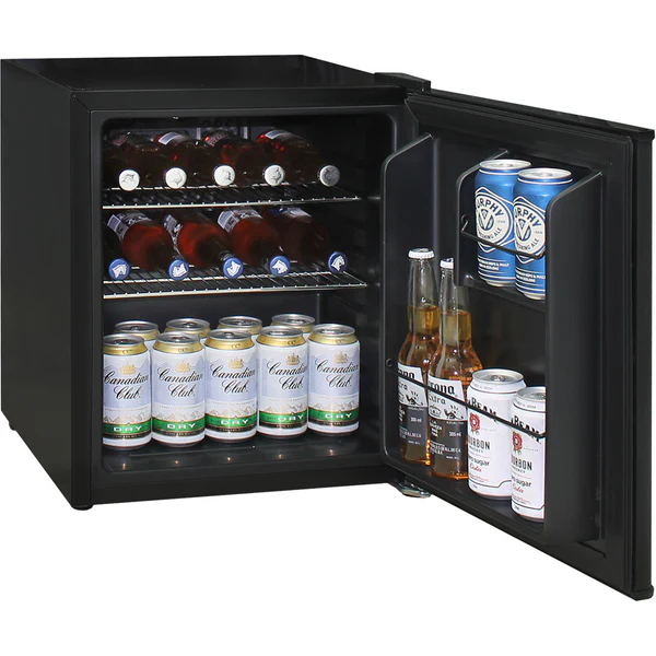 Small Retro Vintage Black Mini Bar Fridge 46 LitreA good quality unit with plenty of shelf height options, tropical rated and runs nice and quiet, unit has cool retro handle and opener.We have many ‘branded’ designs available, so go to Gift Idea’s section on website to see other cool designs. *We brand in-house so please allow a few weeks for delivery.