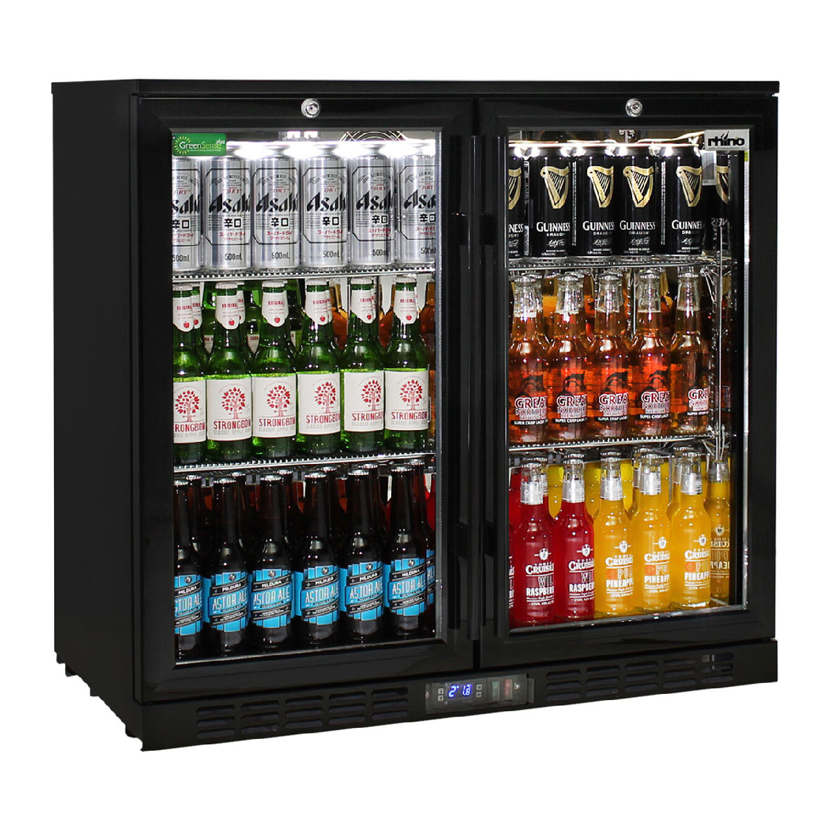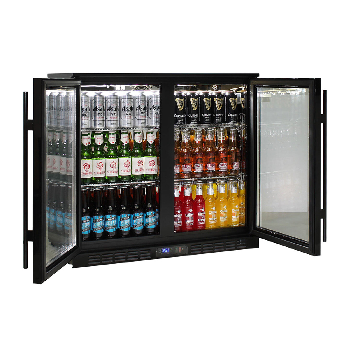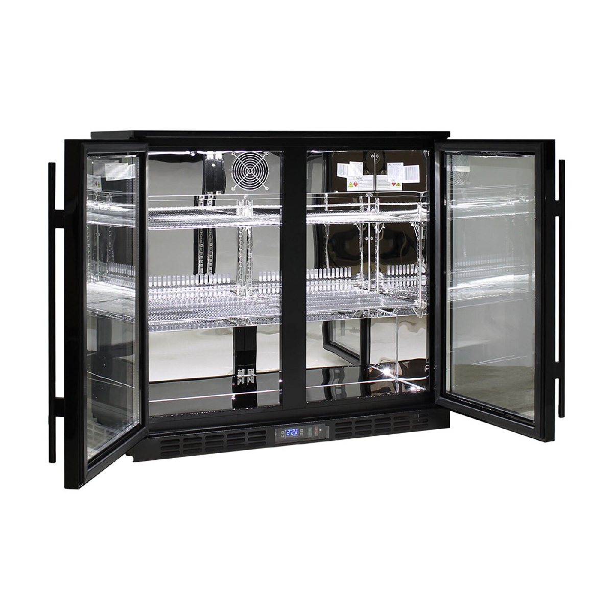 Double Door Commercial Under Bench Bar Fridge. Units encompass the best brand name parts available in the world, designed by the best engineers and built by a quality long term manufacturer, to bring a reliable product to the market. Polished stainless steel inner, LG compressor, LOW E glass, lock and German EBM fans make unit robust for tough conditions.