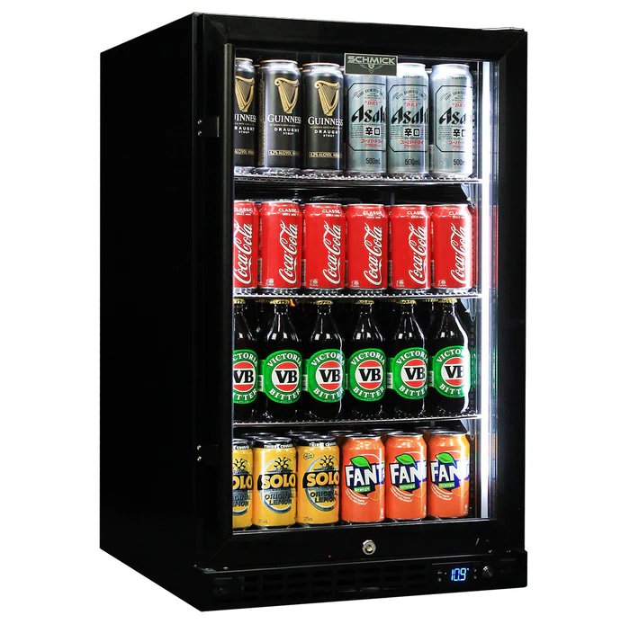 Schmick Quiet Running Front Venting Under Bench Black Glass Door Bar Fridge Heated Glass – Model SK126R-B-HD