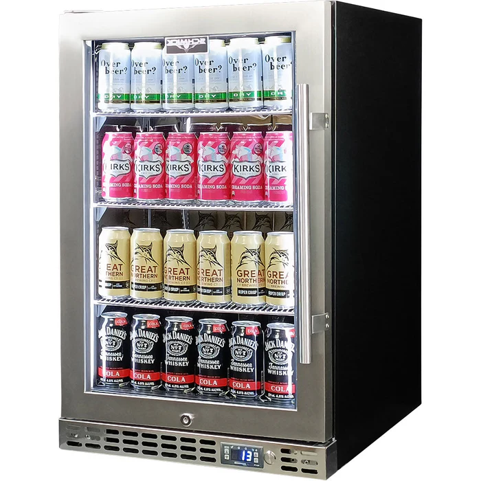 Quiet running under bench front venting glass door bar fridge. Unit has triple glazed LOW E glass to help reduce condensation, the door is reversible with lock and brand name parts including quality Schmick ECO electronic controller, and quiet running Schmick rear and inner fans, Taiwanese transformers and quality low energy compressor for reliable operation.Switchable ‘colour’ LED light can be either blue or white, units have 3 x full ‘soft’ strips on sides and inner top for great lighting effect.*This unit is also available in black door frame and grill (Model SK116 B), and heated glass versions coming September 2020 (Models SK116R HD & SK116L HD).