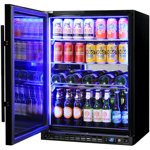 Quiet running under bench front venting glass door bar fridge. Unit has heated glass to stop condensation, the door is lockable and has brand parts that include our own developed Schmick ECO electronic controller and quiet running Schmick rear and inner fans for reliable operation.Switchable ‘colour’ LED light can be either blue or white, units have 3 x full ‘soft’ strips on sides and inner top for great lighting effect.This unit is also available in S/Steel frame and grill (Model SK156-SS), heated glass versions in S/Steel (models SK156R-HD & SK156L-HD), and solid door version, model SK156-SD.