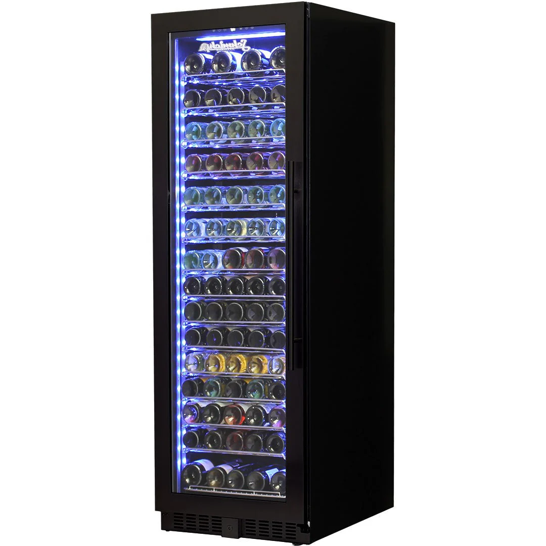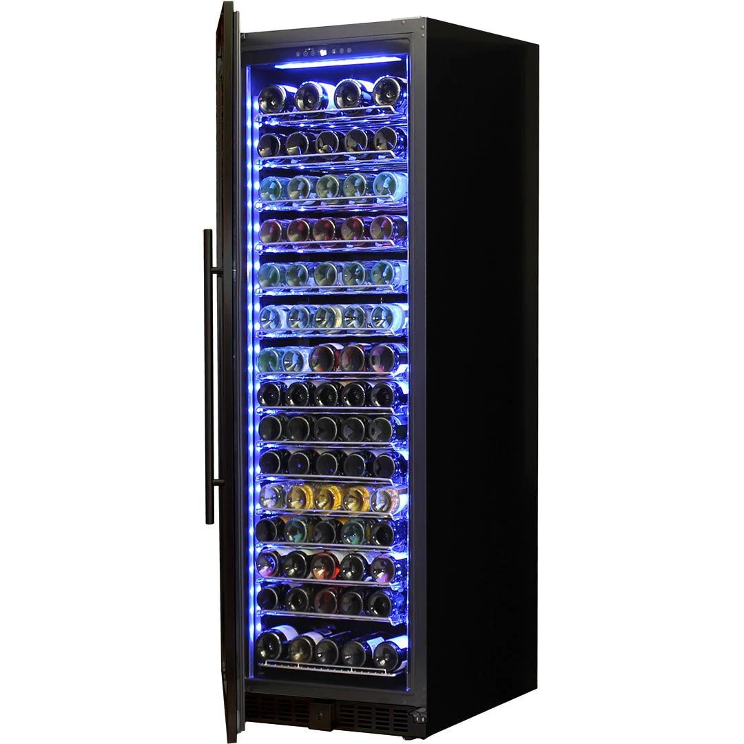 A Stylish Reliable Upright Quiet Running Glass Door Wine Fridge With Quality Brand Name Parts And Plenty Of Features. The Slimline Door Frame And Soft Blue Led Lighting Make It A Real Showpiece For Any Entertaining AreaUnit Is Lockable, Has Triple Glazed LOW E Glass Which Helps Prevent Condensation, Quiet Fans & Is Controlled With Electronic Touch Button Control. The Sliding Rubber Saddles Allow Every Size Wine Bottle To Fit With Ease, A Great Feature.The Shelving Also Can Be Moved Up/Down, Giving You Plenty Of Different Size Bottle Storage Options.